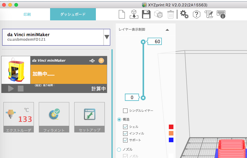 このファームウェアとソフトウェアはMac版はないのだが、Windowsでアップデートをかけてやると以降はMac版の古いアプリでも動作できるようだ。通常に造形できた